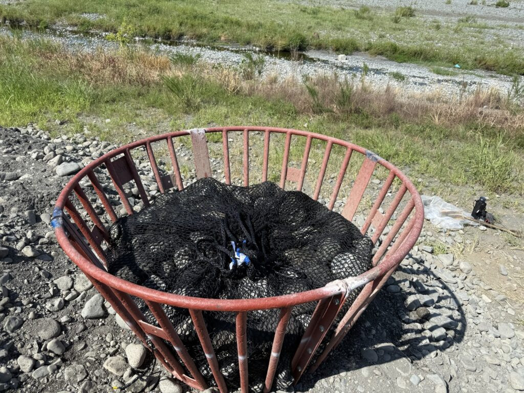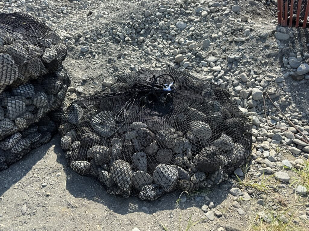 特殊な網状の袋に玉石を入れて