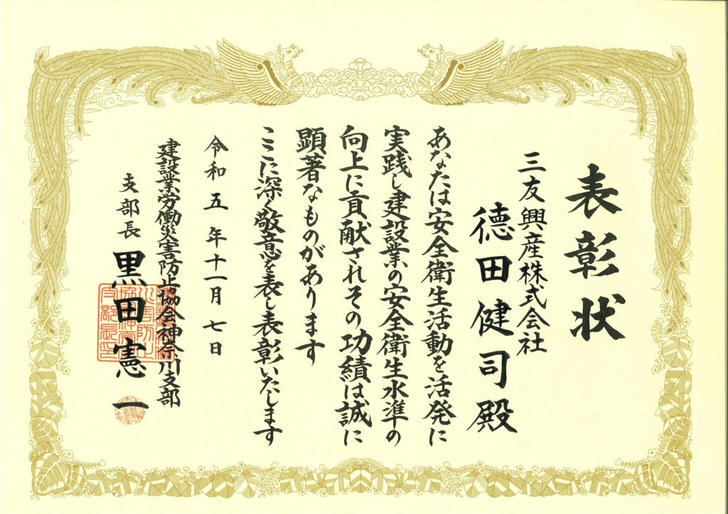 建設業労働災害防止大会にて 2023.11.09| お知らせ 建設業労働災害防止協会神奈川支部より表彰状を頂きました!(^^)今まで社員の皆と協力業者が安全第一にて工事を施工してくれたおかげです!ありがとうございました!今後も安全第一でお願いします!(^^)