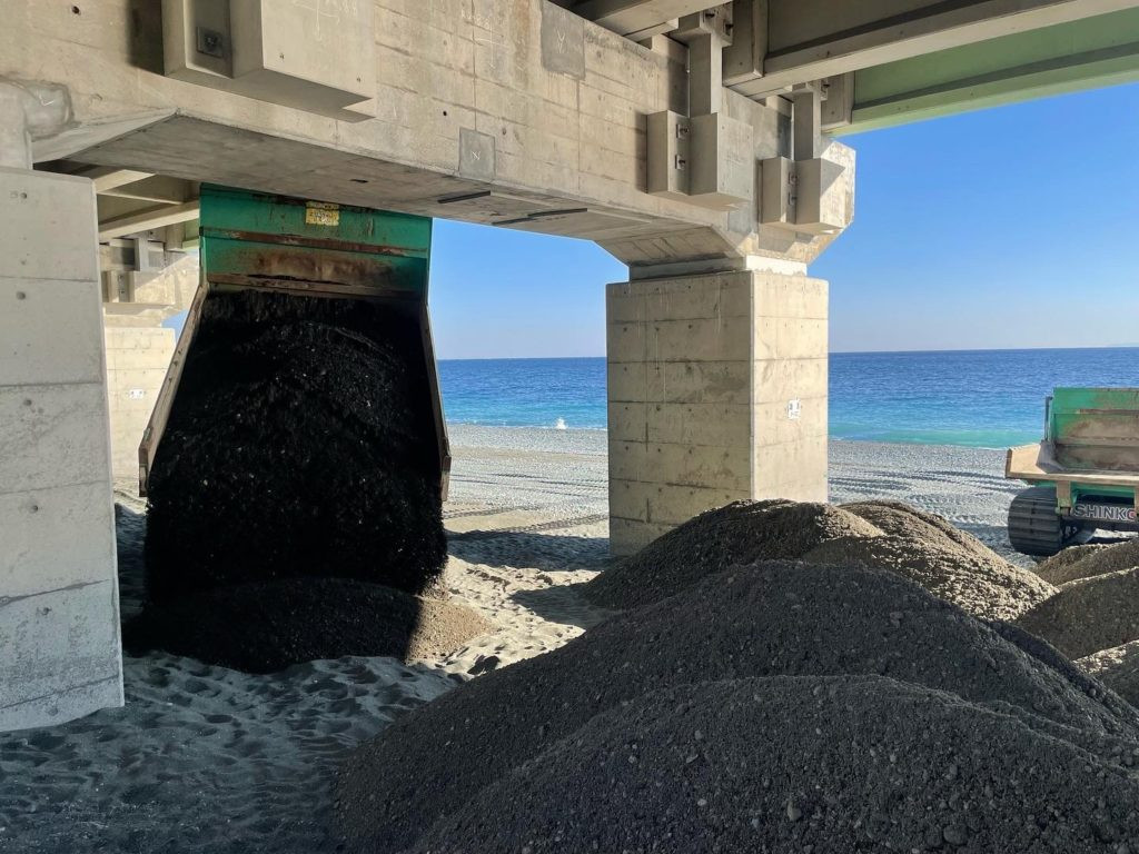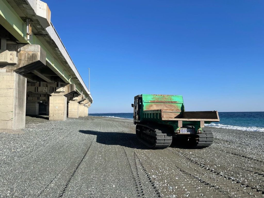 今日から、海岸への砂の敷均しに着手!1日に500m3!合計15000m3を敷均します!(^^)